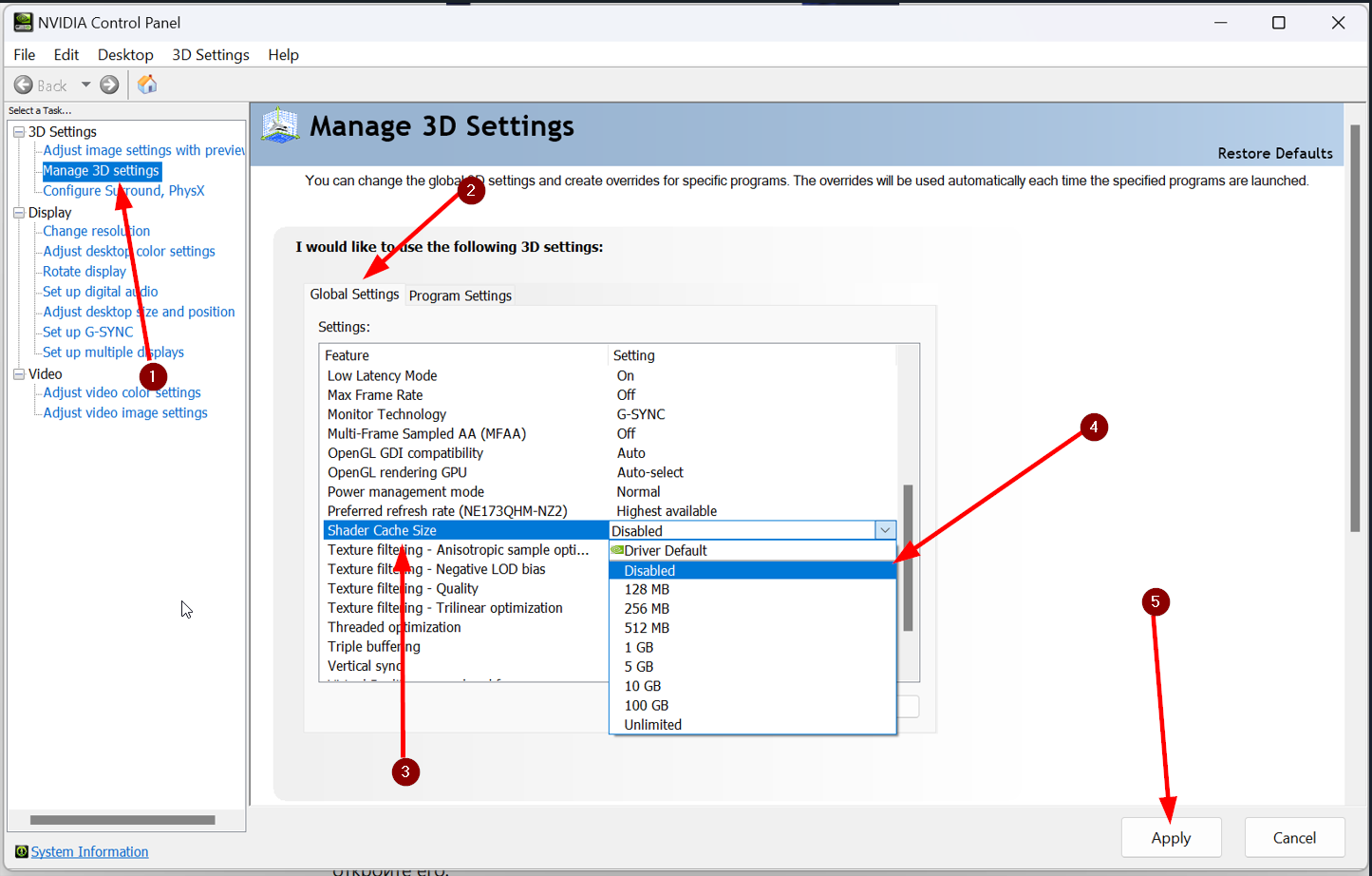 4. 「グローバル設定」タブのリストにある「シェーダーキャッシュサイズ」オプションを「無効」にする。