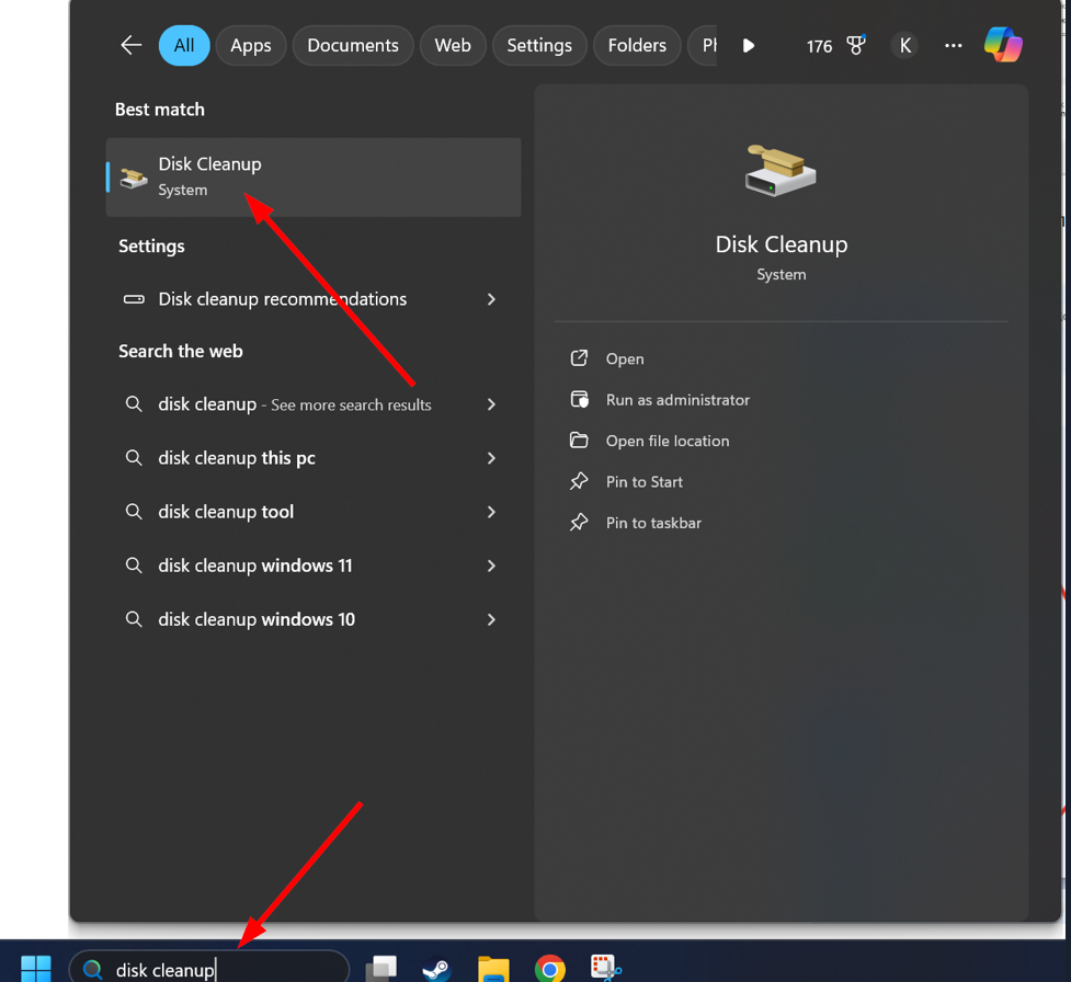 6. Windowsの検索機能でディスククリーンアップのアプリケーションを検索して開く。