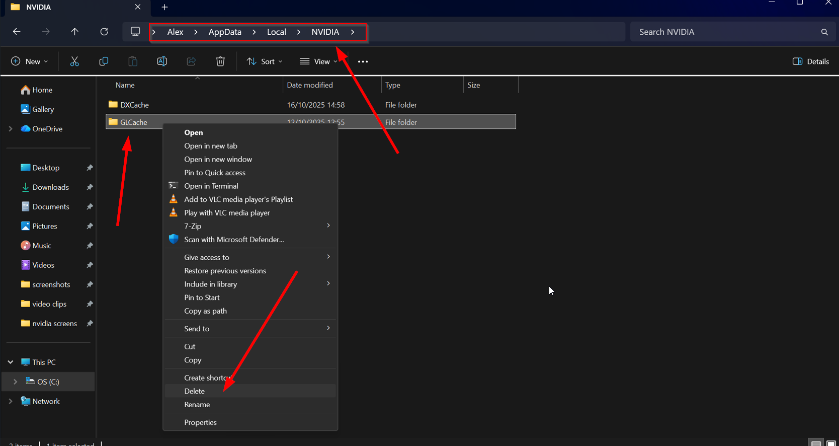 11. 「NVIDIA」フォルダを開き、「GLCache」フォルダを開いて中身をすべて削除する。フォルダが空の場合やフォルダが存在しない場合は、この手順をスキップしてください。