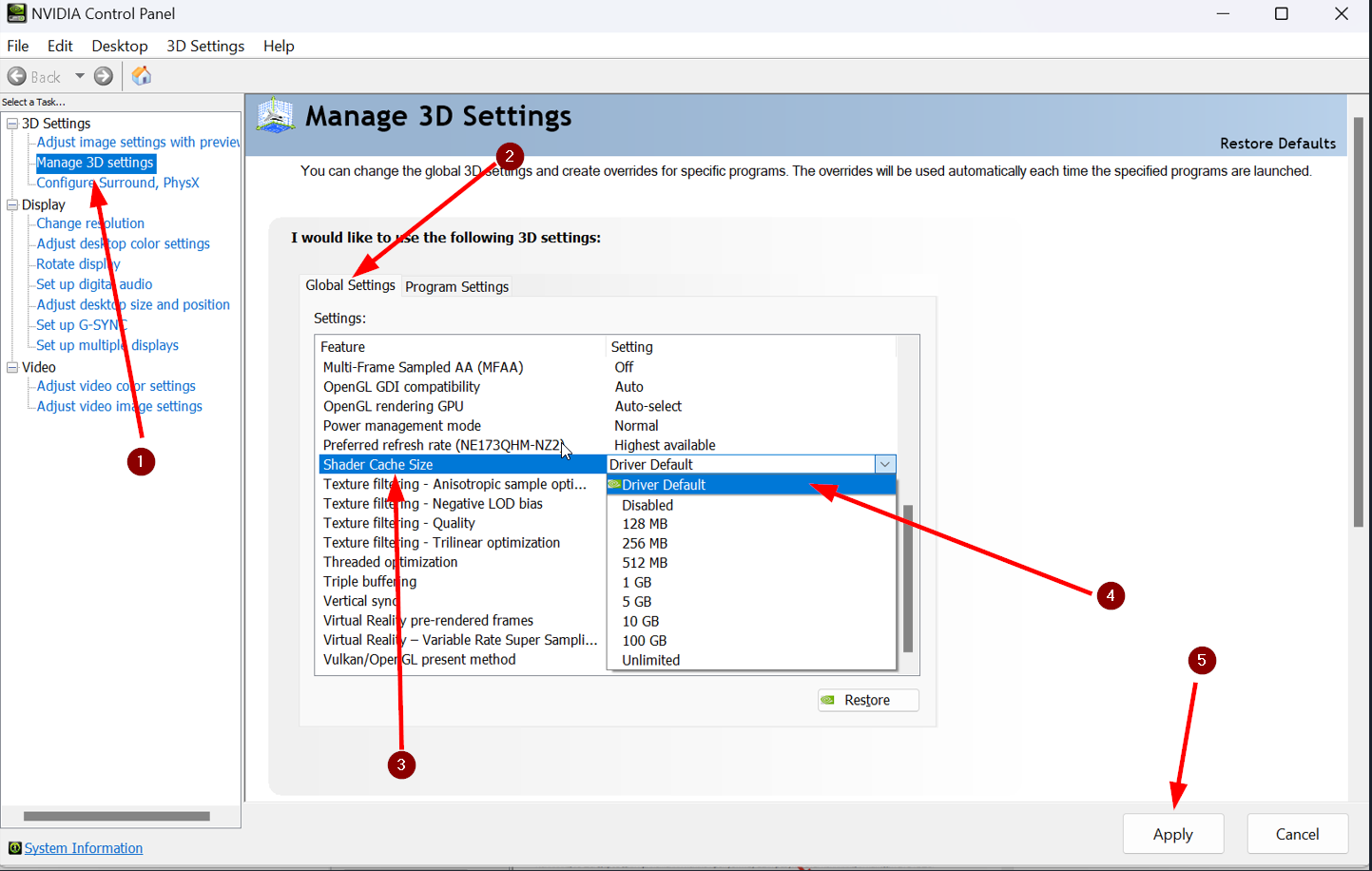 19. 手順2をもう一度行い、NVIDIA コントロールパネルを開く。今回は、「シェーダーキャッシュサイズ」を「ドライバのデフォルト」に設定し「適用」をクリックする。