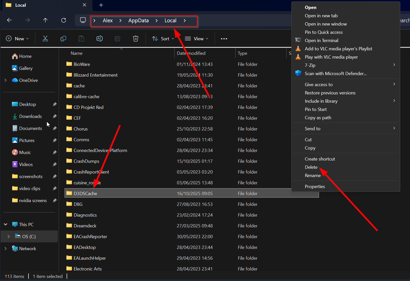 13. 「D3DSCache」フォルダを開き、中身をすべて削除する。フォルダが空の場合やフォルダが存在しない場合は、この手順をスキップしてください。
