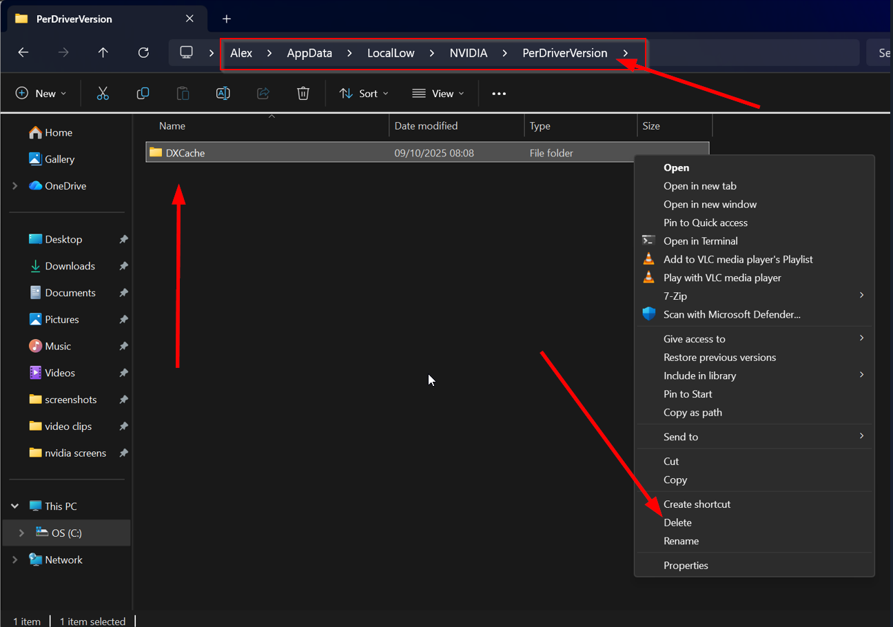 15. 「NVIDIA」フォルダを開き、「DXCache」フォルダまたは「PerDriverCache\DXCache」フォルダの中身を削除する。フォルダが空の場合やフォルダが存在しない場合は、この手順をスキップしてください。