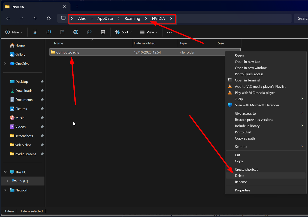 18. 「NVIDIA」フォルダを開き、「ComputeCache」フォルダの中身を削除する。フォルダが空の場合やフォルダが存在しない場合は、この手順をスキップしてください。