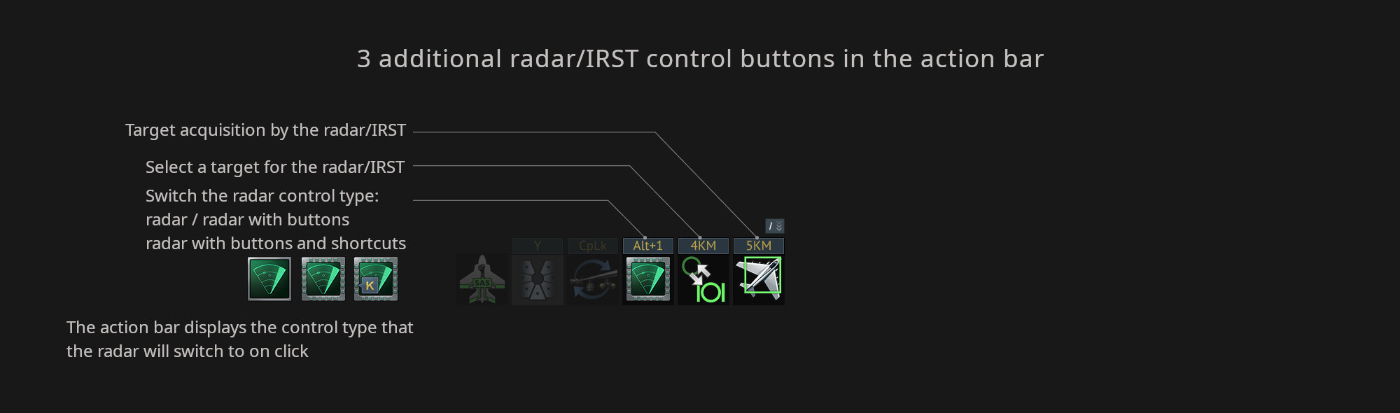 アクションバーにはさらに2つのアクション:「レーダー / 赤外線捜索追尾システムの目標をロックオン(Lock Radar/IRST on target)」と「レーダー / 赤外線捜索追尾システムを選択して目標をロックオン(Select Radar/IRST target to lock)」があります。(こちらは「航空レーダーの選択目標切り替え表示(Cyclic target switching of aircraft radar)」のオプション設定が有効時のみ作用)。