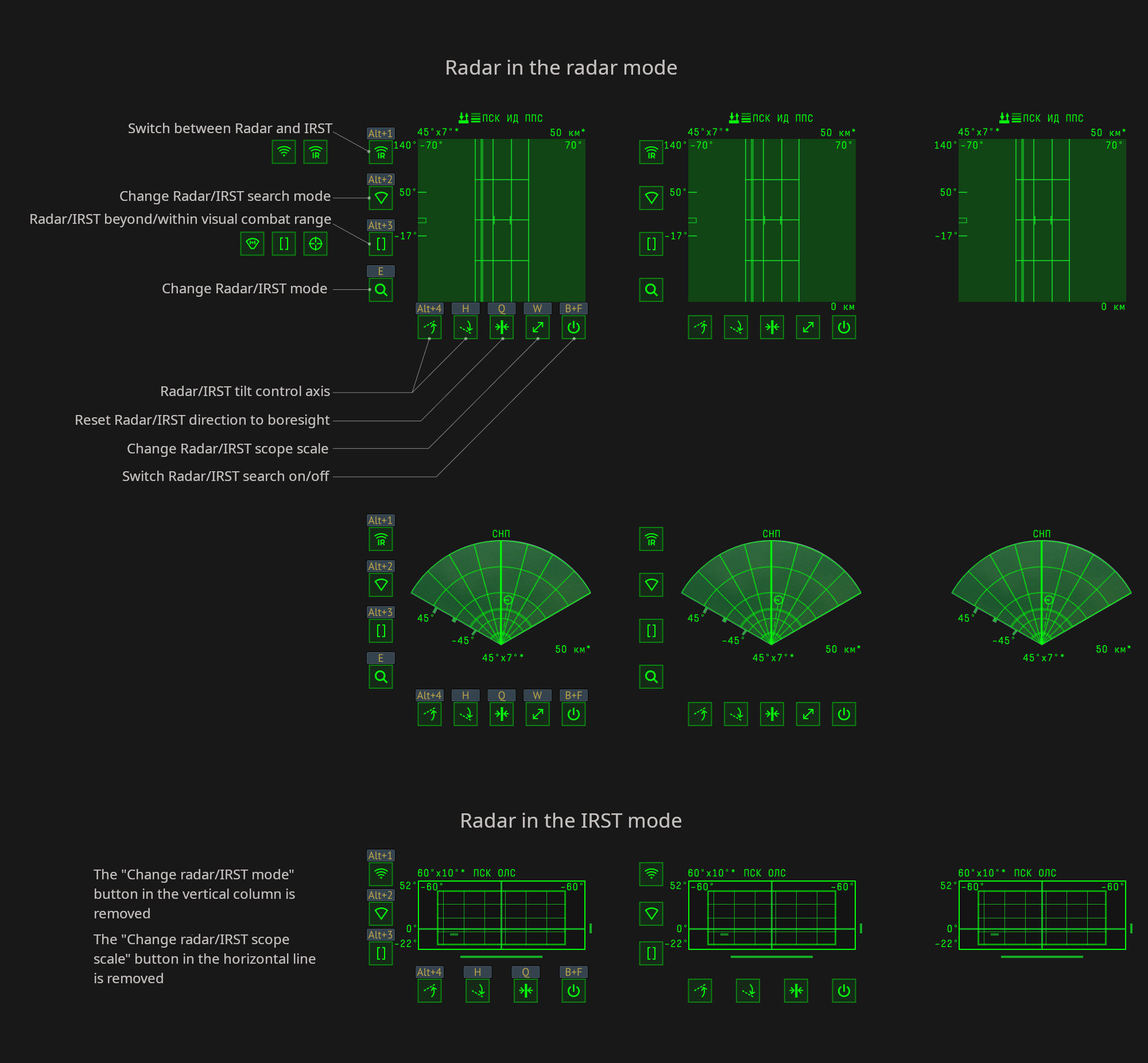 大型アップデート「タスクフォース(Tusk Force)」で実装される航空機のレーダー画面はインタラクティブになり、マウスカーソルでクリックできるようになります(「マウスカーソルを表示する(Show mouse cursor)」ボタン有効時)。レーダー上の目標は、単純にクリックするだけで選択可能になり、ダブルクリックすることで即座に好きな目標を捕捉できます。表示されている記号をクリックすることでレーダーのモードや範囲を変更することができ、マウスボタンを押し続けると(「選択目標切り替え表示(Cyclic target switching)」が無効時)、レーダーのスキャン範囲、または捕捉カーソルを動かすことができます。