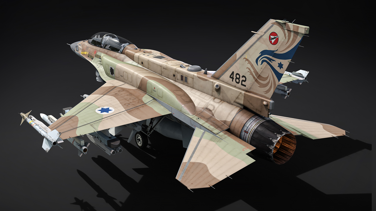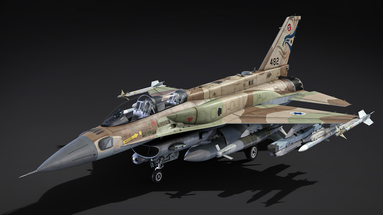 積載量の増加については、スーファは幅広い懸架武装の選択肢を維持しつつも、最新の赤外線誘導ミサイル(AIM-9LおよびAIM-9M)やアクティブ・レーダー・ホーミングミサイル(AIM-120C-5)に加え、さまざまな精密誘導爆弾および無誘導爆弾など、新たな兵装も搭載することができます。対地攻撃用の兵装の中では、TV誘導を備えるSPICE爆弾の250kg(ゲーム初登場)から2,000kgまでのラインナップが特筆に値するでしょう。そのため、F-16Iは混合戦において敵の防空網に近づきすぎることなく、より優れた精度で攻撃任務を遂行することが可能です。さらに注目すべき点として、パイロットが接近するミサイルを常に把握することができるPAWS-2 MAWS(Missile Approach Warning System:ミサイル警報装置)も備えています。