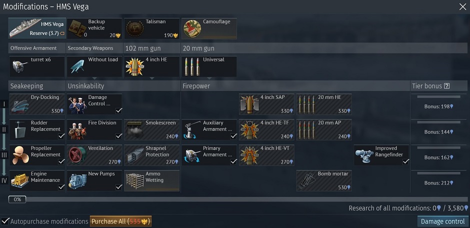 3種類のダメージコントロールオプションのいずれか1つのみを実行している場合、それは最大速度で作業します。さらに、艦が損傷を受けると同時に自動開始されるため、プロセスを始めるためにボタンを押す必要がなくなりました。3つのプリセットを切り替え、直面している戦術状況に基づいて優先するプロセスを変更できます。