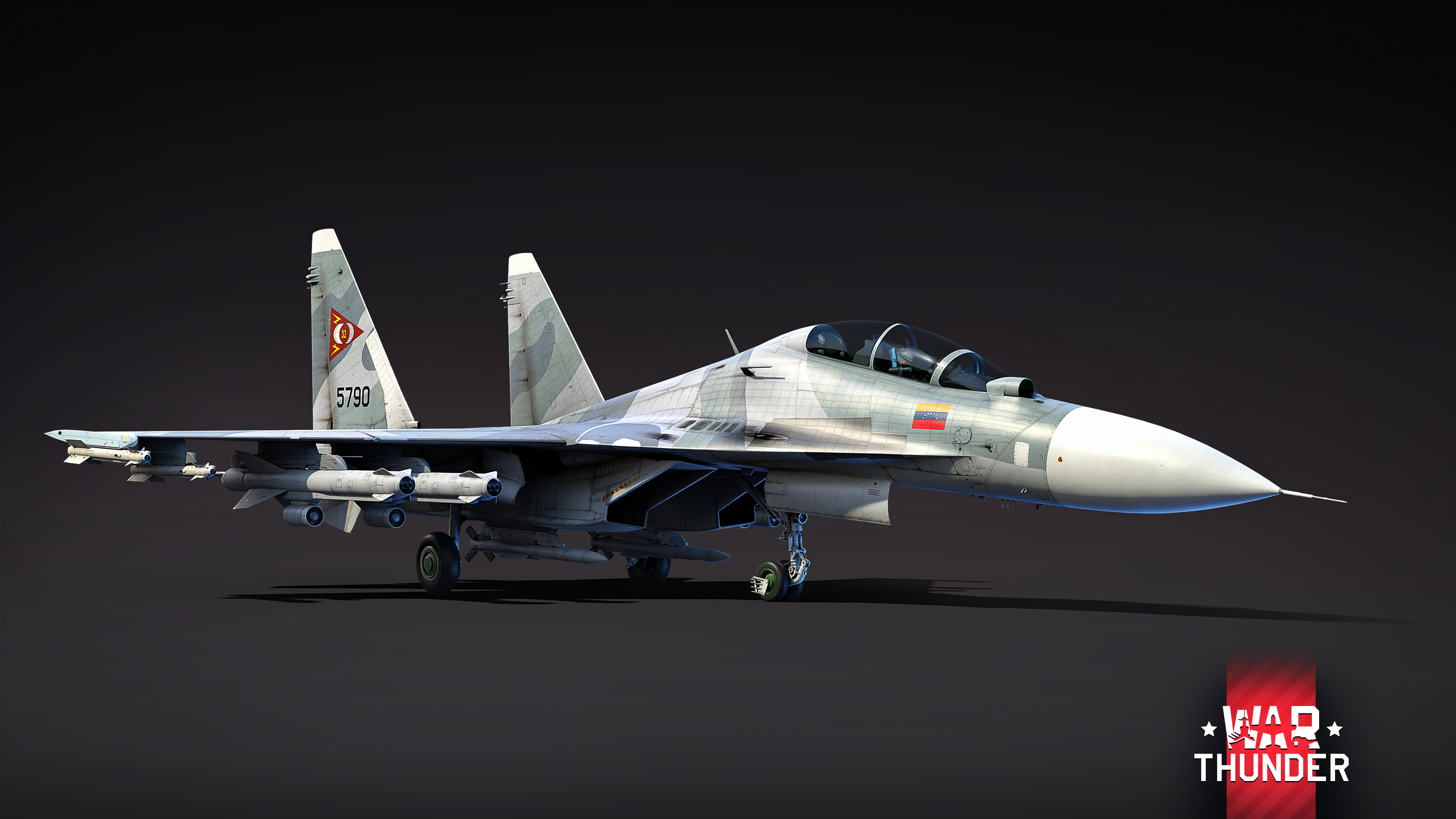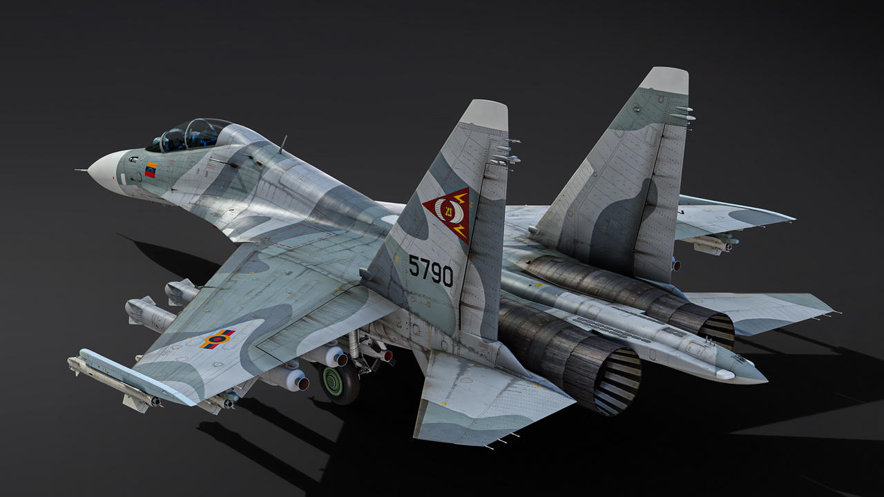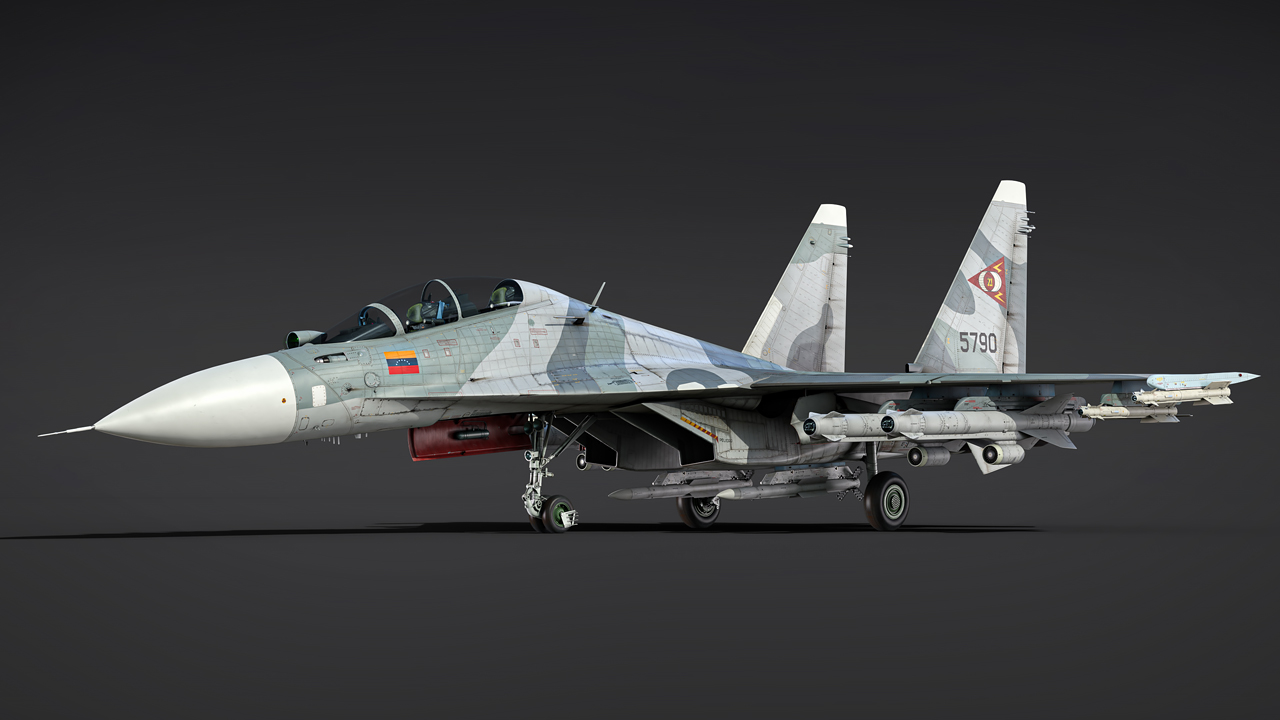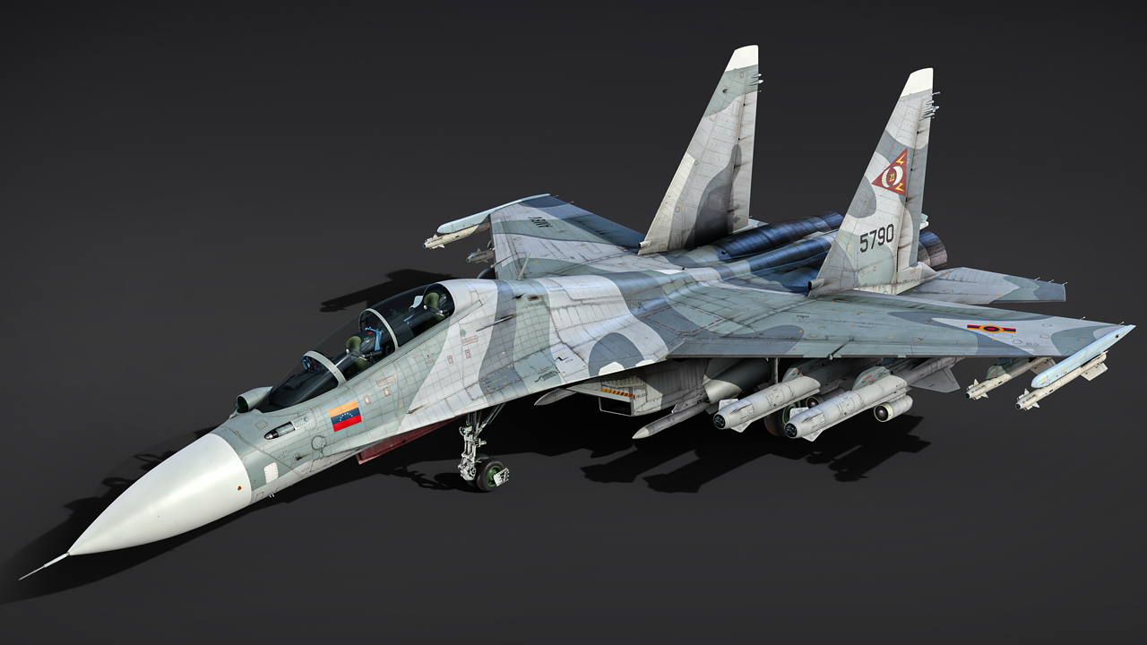 この航空機の副武装メニューを開くと、あらゆる任務やプレイスタイルに対応した膨大な数となる兵装の組み合わせに圧倒されることでしょう。しかも、これは自身で作成可能なプリセットを含めていません!このベネズエラ空軍仕様の機体は、従来のスホーイ航空機と比較して、兵装の構成が僅かに異なっています。実績のあるR-73短距離ミサイルに加え、データリンクを備えたR-27R SARH(semi-active radar homing:セミアクティブ・レーダー・ホーミング)ミサイル、妨害耐性を備えたR-27ETミサイル(すべて輸出型仕様)といった空中戦用の兵装に加え、ARH(Active Radar Homing:アクティブ・レーダー・ホーミング)シーカーを備えたRVV-AE(R-77の輸出型)も使用可能です。