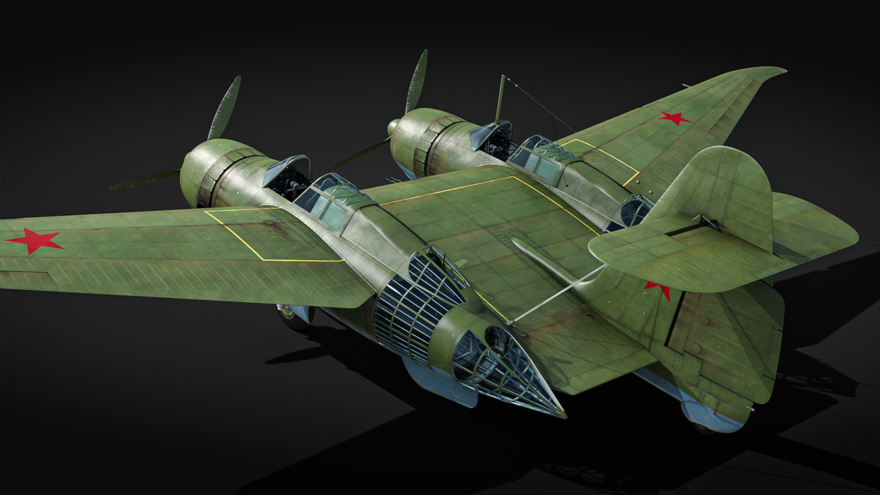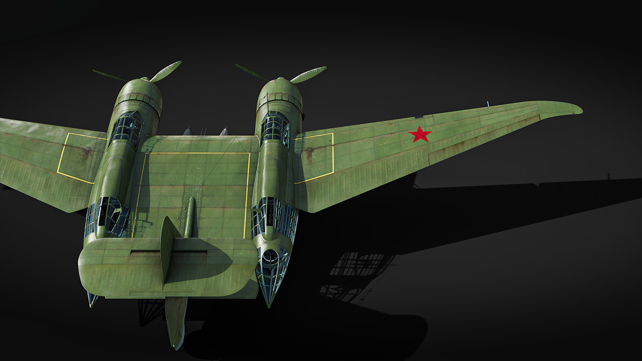 DB-LKは、2つのコックピットを備えた双胴爆撃機で、全体的に珍しい構成をしています。コックピットの1つはパイロット用で、もう片方は航空士/爆撃兵用となっています。本機はM-87Bエンジンを2基備えており、この緑の全翼機を初期の爆撃機としては相当な速度まで加速させます。