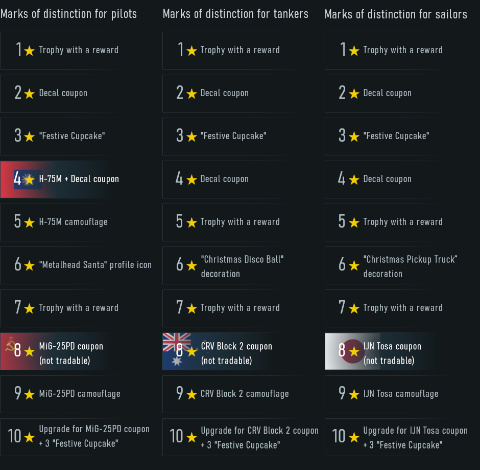 フェスティブカップケーキには、過去のウィンターイベントの兵器、カモフラージュ、デカール、装飾、プロフィールアイコンが含まれています。便利な消耗品も獲得でき、これにはブースター、汎用バックアップ、賭けおよび指令が含まれています。一部のアイテムは、今回初めてクーポンとして登場します!