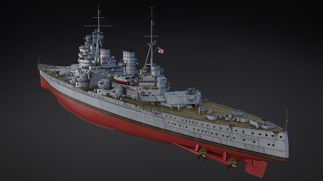 『War Thunder』において、HMS プリンス・オブ・ウェールズはイギリスの「大型艦:外洋海軍(Blue-Water)」のランクVIに登場します。艦首と艦尾に4門の356mm主砲塔1基ずつという特異な主砲構成が特徴で、さらに前部砲塔の直線軸上に2門の356mm砲を配置した砲塔を備えています。副武装は16門の133mm両用砲で構成され、対空砲の核となるのは有名な八連装40mmポンポン砲であり、40mmおよび20mm機関砲によって補完されています。装甲は頑丈ですが、艦体中央に集中的に配置されています。主装甲帯は最大381mm、装甲甲板は152mmの厚さを誇ります。HMS ヴァンガードなどイギリスのトップランク戦艦と同様、HMS プリンス・オブ・ウェールズは火力よりも装甲と生存性の向上を優先しています。戦闘では、重装甲の敵に対しては巡洋艦と連携して接近するか、遠距離から攻撃して上空からダメージを与える必要があります。しかし、HMS プリンス・オブ・ウェールズは、あらゆる戦闘で主役級の活躍を見せ、壮大な瞬間と驚異的な生存性で皆さまを魅了することでしょう!