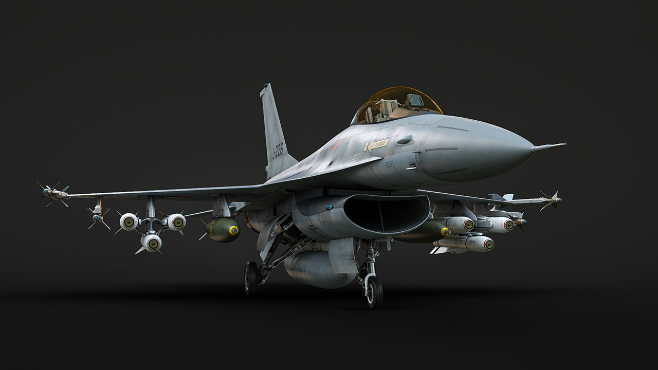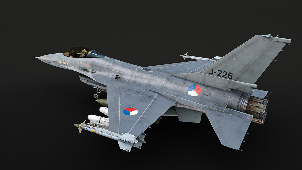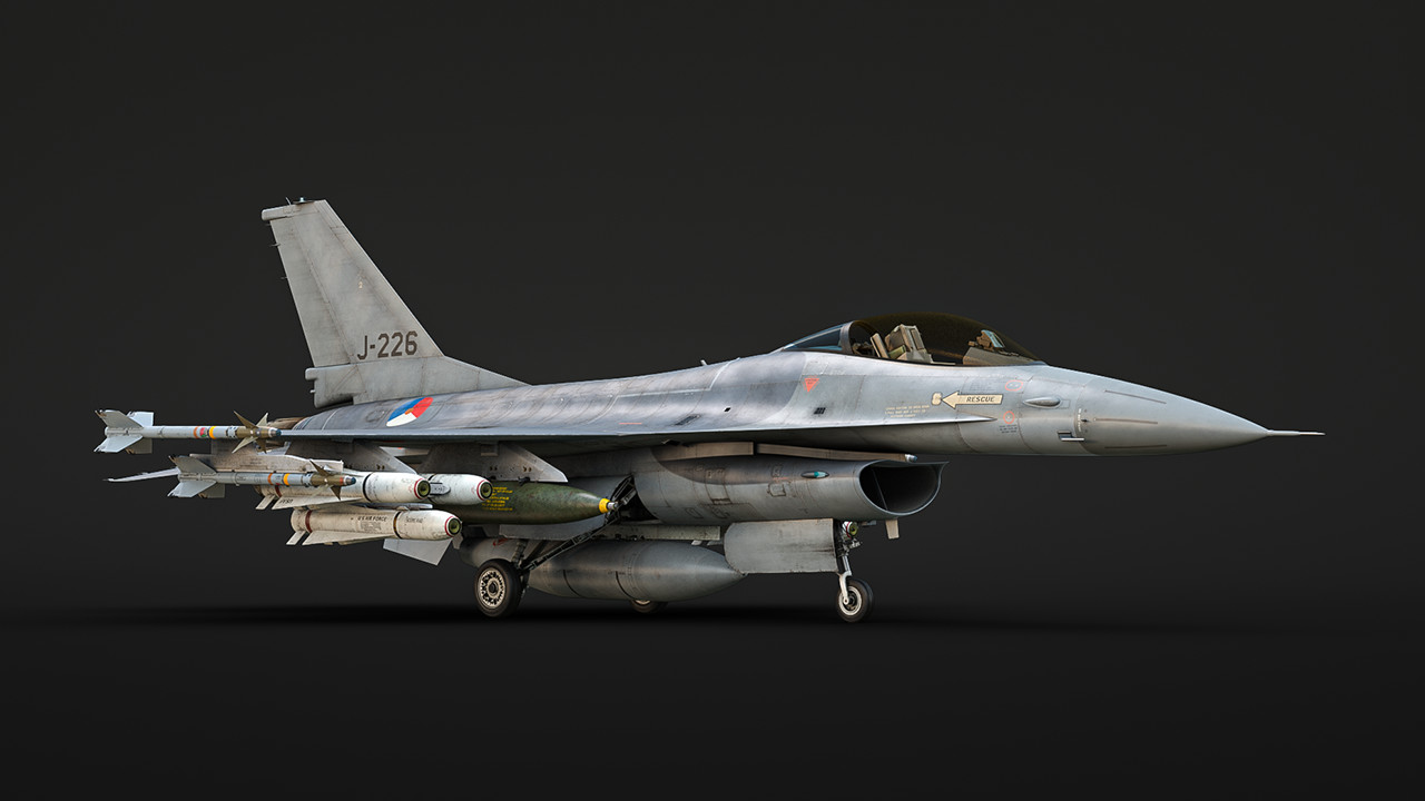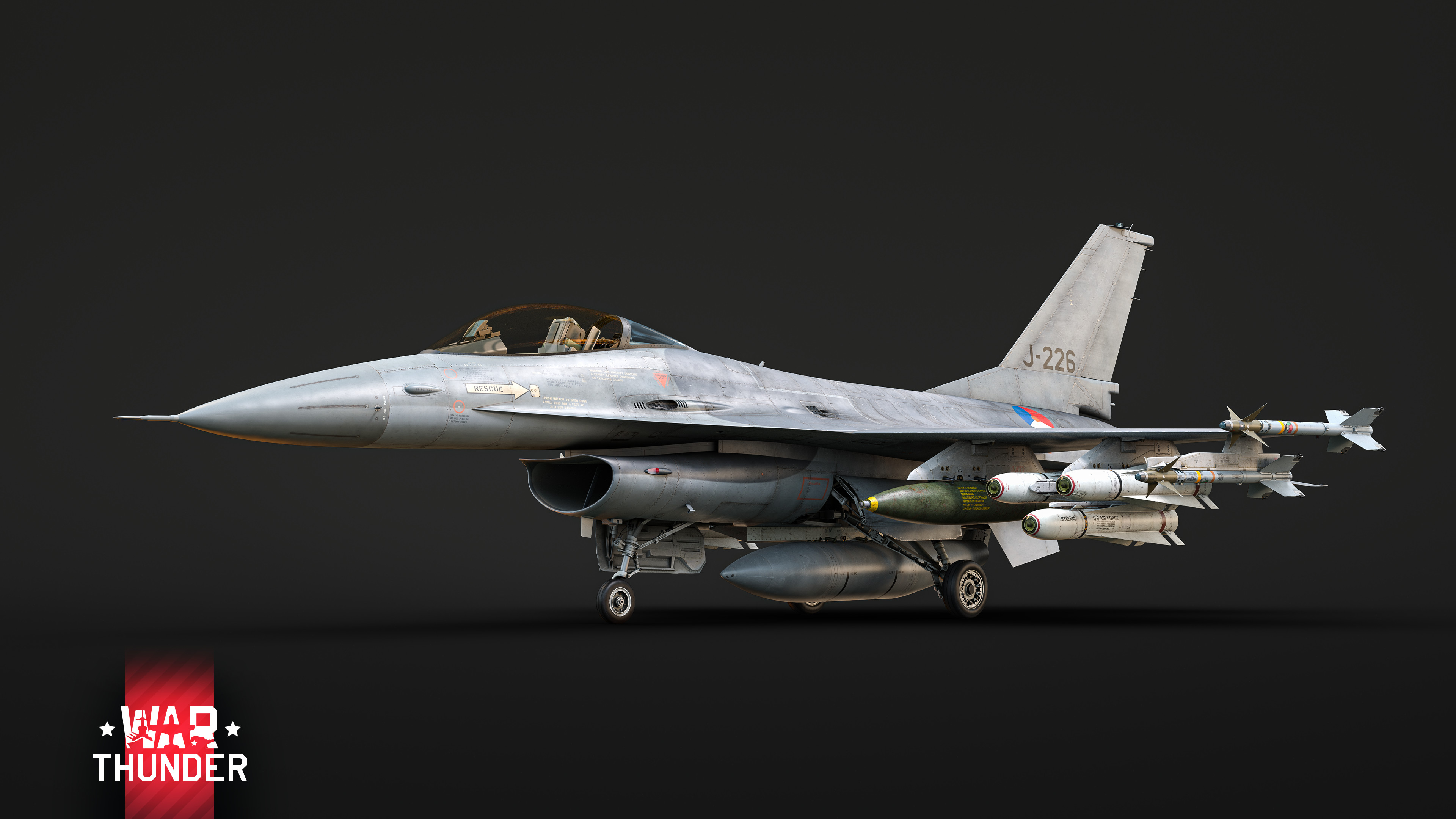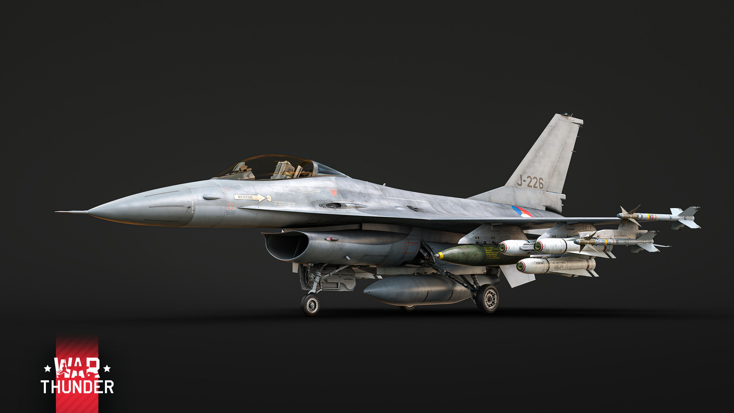 空対空戦闘では、AIM-9P赤外線誘導ミサイルとオールアスペクト(全方位)発射能力を備えるAIM-9L赤外線誘導ミサイルを使用可能です(本モデルは先進的なARH(Active Radar Homing:アクティブ・レーダー・ホーミング)能力を備えていませんでした)。また、このオランダ王立空軍仕様の機体は、対地攻撃の構成においても非常に魅力的です!最大19発の500ポンド爆弾、最大4発の大型2,000ポンド爆弾、最大114発のロケット弾、精密地上攻撃用のAGM-65Bマーベリックミサイルを搭載可能であるため、高ランクの戦車戦ラインナップに加えるには最適な一機となるでしょう。また、初期のF-16シリーズに特徴的な幅広い電子機器も備えています。敵ミサイル防御用に高性能AN/APG-66レーダー、RWR(レーダー警報受信機)、フレア60発を備え、爆弾およびミサイル用の弾道計算機も利用可能です。