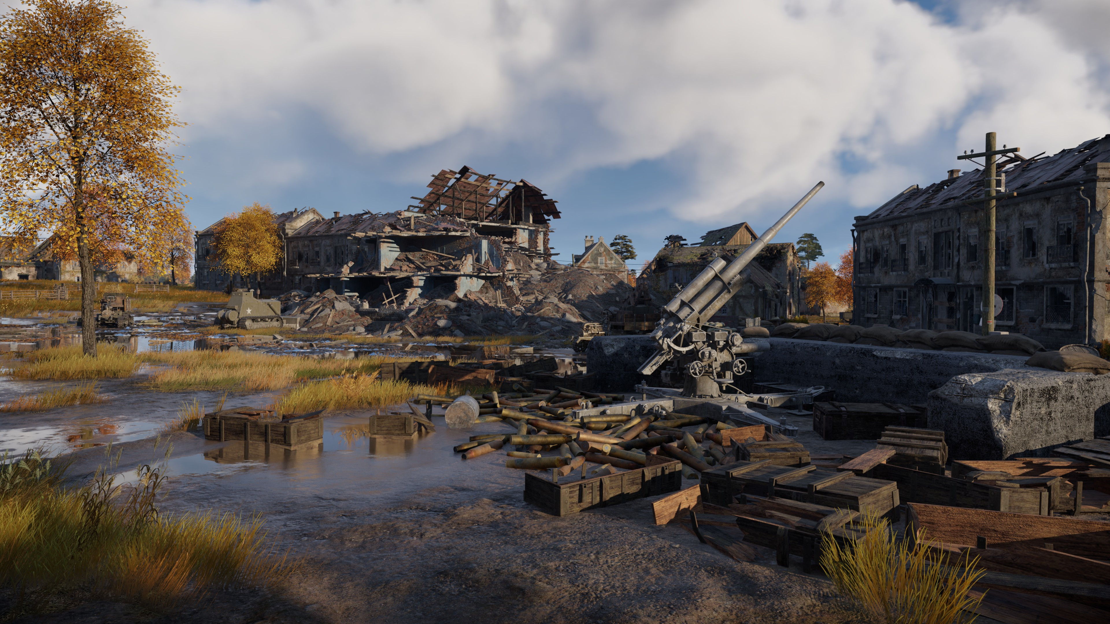 広大な秋のロケーション「アルデンヌ」も全面的に刷新されました。放棄された射撃陣地、倒壊した家屋、水たまりや泥濘、そしてもちろん黄金色に染まった木々など、すべてが最新のグラフィック基準に合わせて細部まで豊かに描写されています。進入路や迂回路、地形といった基本的な道順に変更はありません。興味深い新要素として、放置されたブルドーザーやトラクターなどの機材にご注目ください。これらは車体で押し出すことで、一時的な移動式遮蔽物として利用することができます。