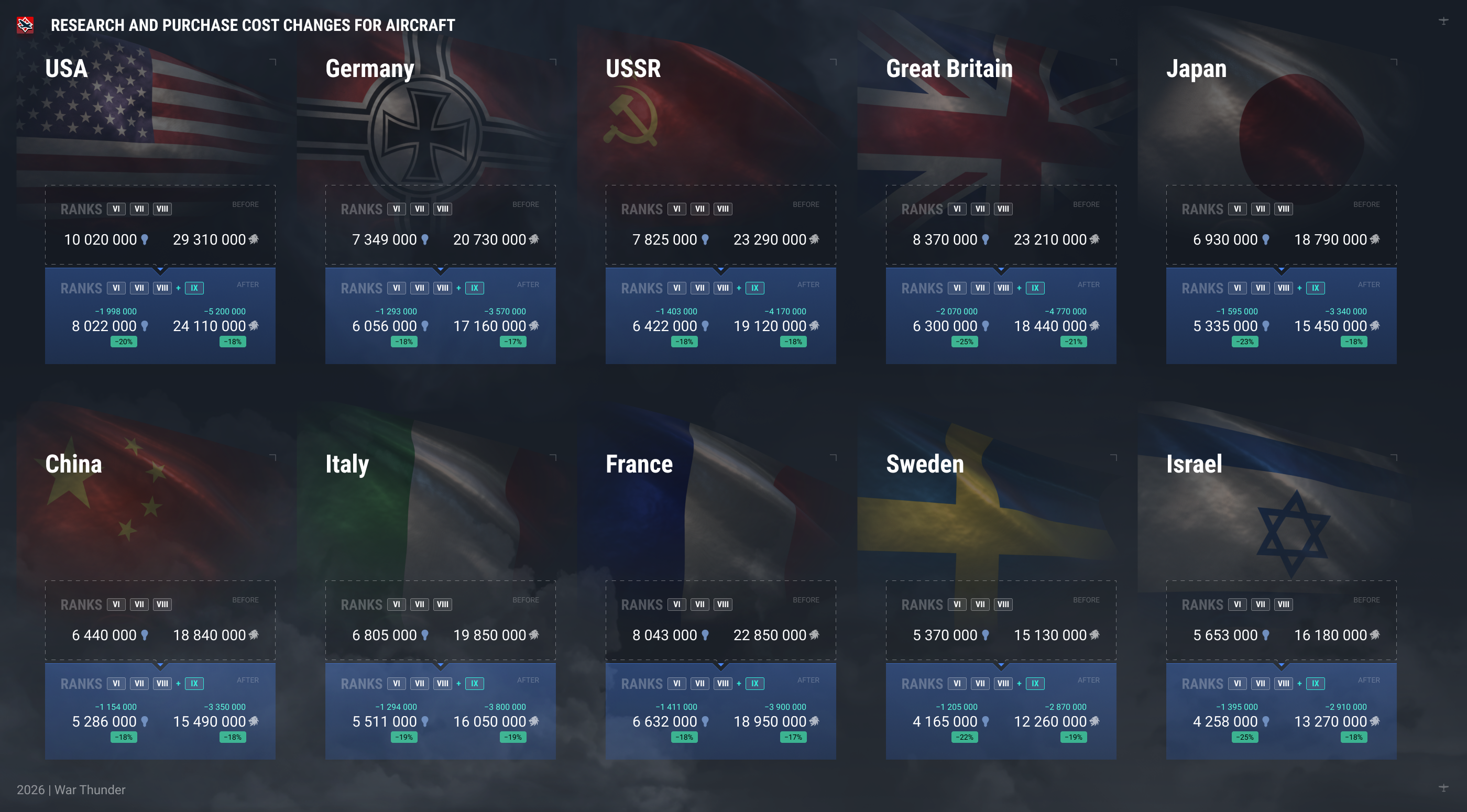 変更前のランクVI~VIIIと変更後のランクVI~IX航空機の研究・購入コストの違いは、下記画像により比較確認できます。